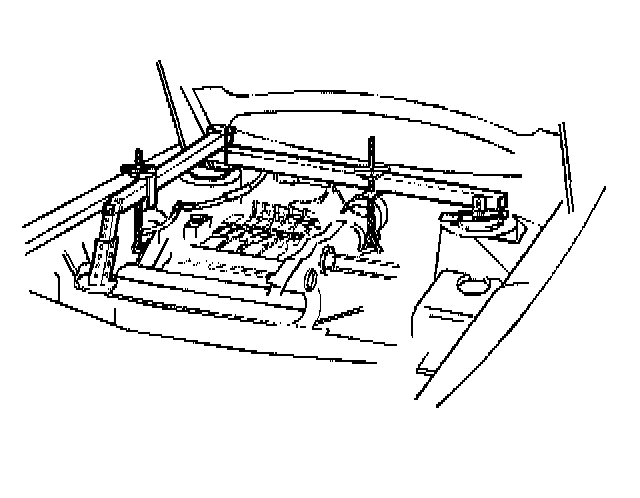 13. Raise the frame and/or lower the vehicle while locating the engine and transmission mount studs into the frame, harnesses at the frame, and the frame mount bolt holes to the underbody.