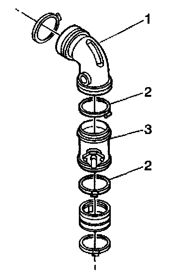 3. Loosen the hose clamps (2) at the bottom and top of the MAF/IAT sensor.