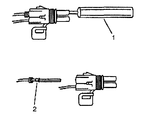 ^ Insert the Weather Pack(R) terminal removal tool into the front (mating end) of the connector cavity until it rests on the cavity shoulder (1).