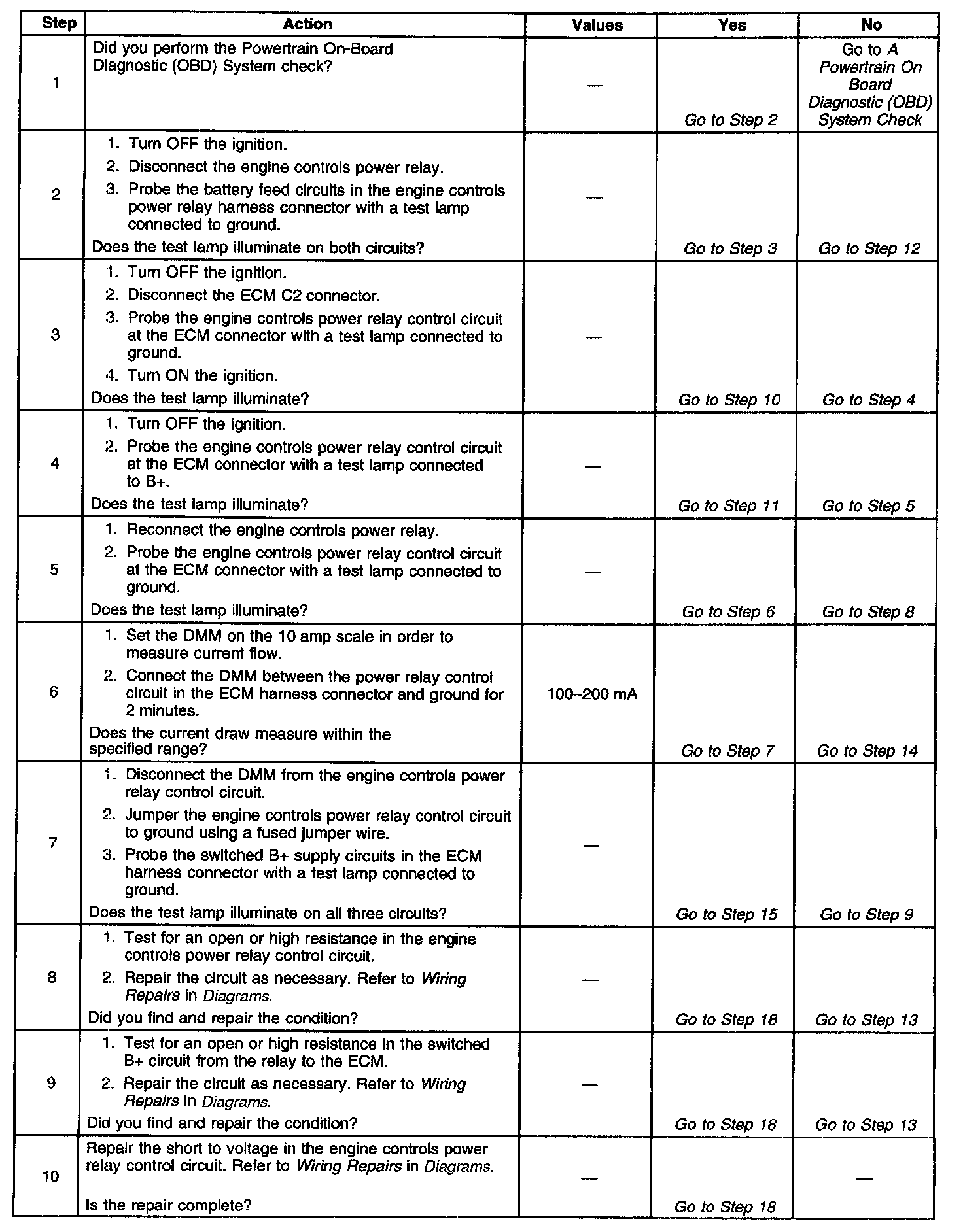 The engine controls power relays coil and contacts are connected directly to the battery positive voltage (B+). The Engine Control Module (ECM) controls the relay by grounding the control circuit through an internal solid state device called a driver. When the ECM detects a voltage on the ignition feed circuit, the ECM enables the engine controls power relay. The engine controls power relay controls the switched B+ circuit to the fuel pump relay coil, the fuel injectors, the Heated Oxygen Sensor (HO2S) heaters and the other engine control components that use a switched B+ supply. The ECM also uses the switched B+ circuit to power up a portion of itself, including the circuitry which controls the Malfunction Indicator Lamp (MIL) operation.