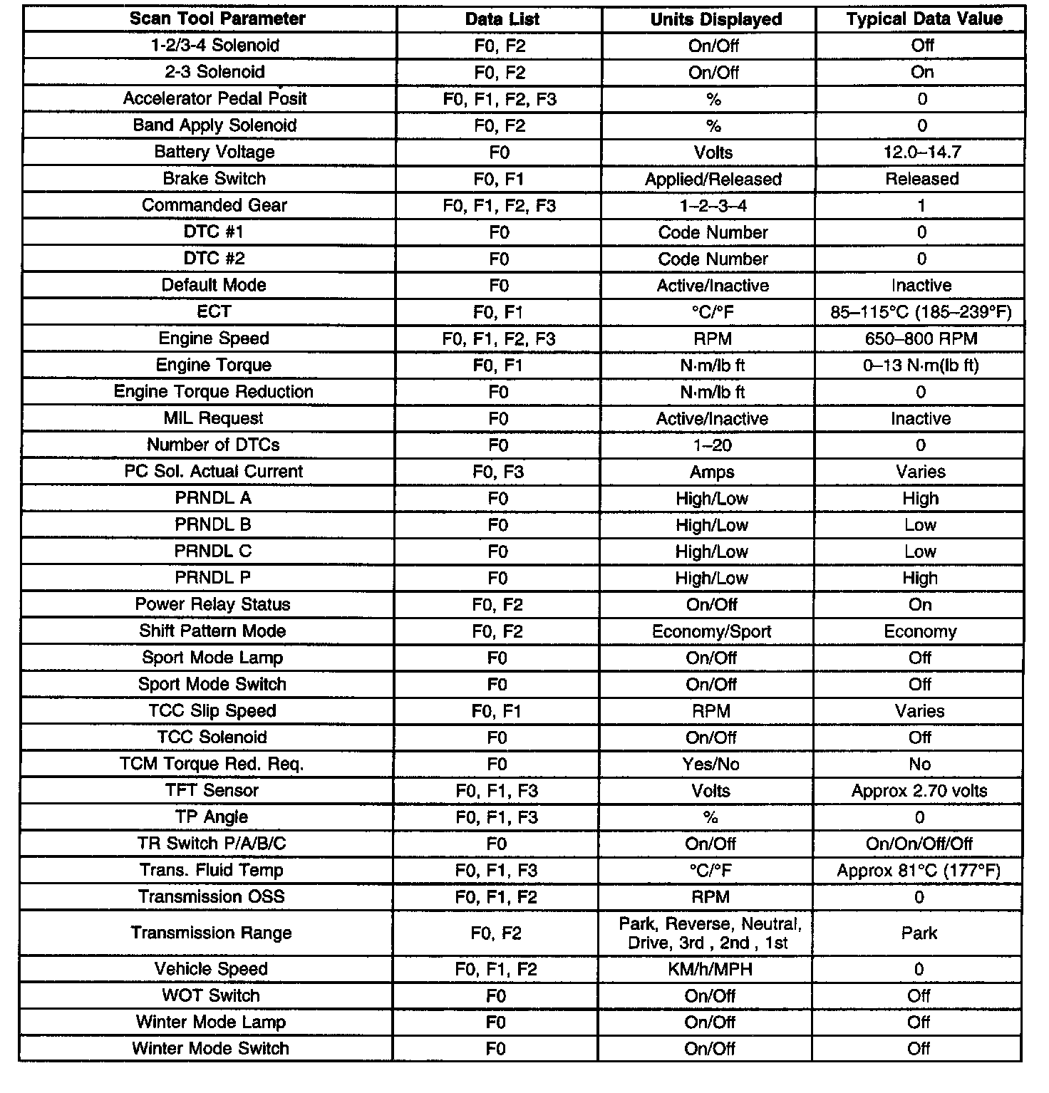 Only the parameters listed below are used in this service manual for diagnosing. If a scan tool displays other parameters, the values are not recommended by General Motors for use in diagnosis.