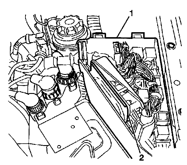 3. Remove the Engine Control Module (ECM) (2) from the relay center (1). Move the ECM harness to one side.