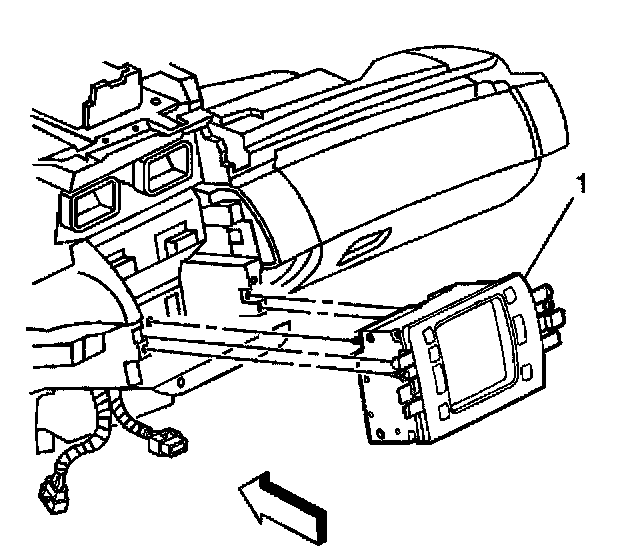 2. Align the navigation display alignment pins to the IP opening and push the navigation display (1) toward the front of the vehicle until an audible click is heard.