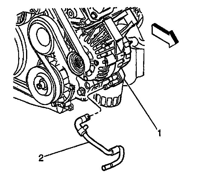 5. Remove the generator cooler outlet hose retaining bolt (2).