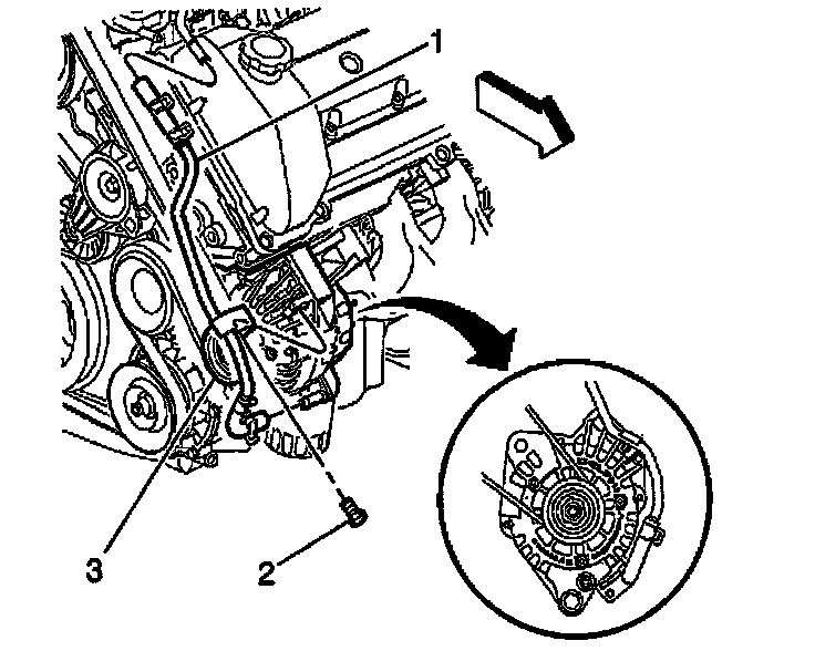 6. Install the generator cooler outlet hose retaining bolt (2) to the generator (3).