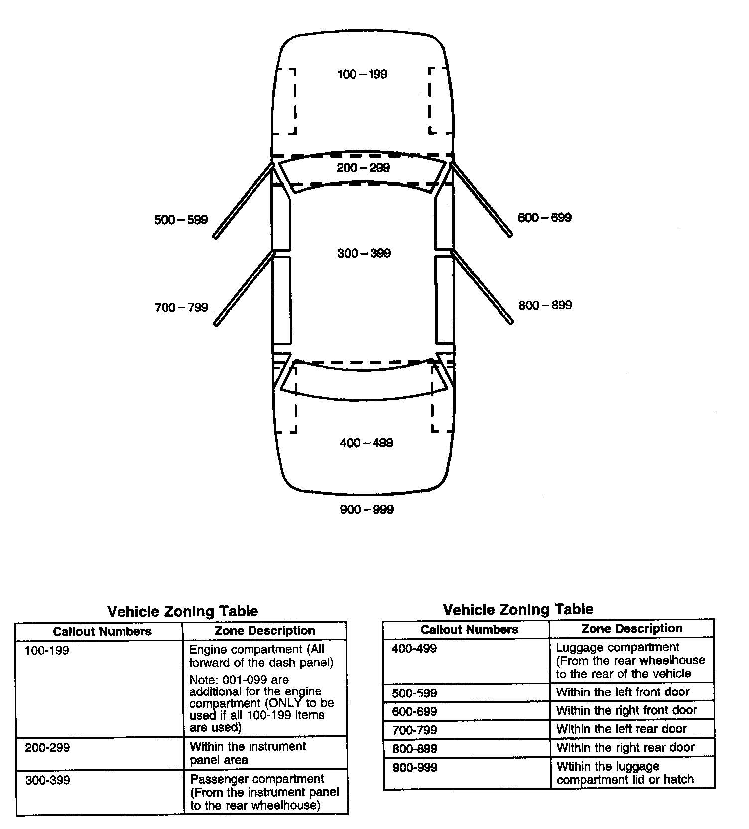 All grounds in-line connectors, pass-through grommets, and splices have identifying numbers that correspond to where they are located in the vehicle. The following table explains the numbering system.