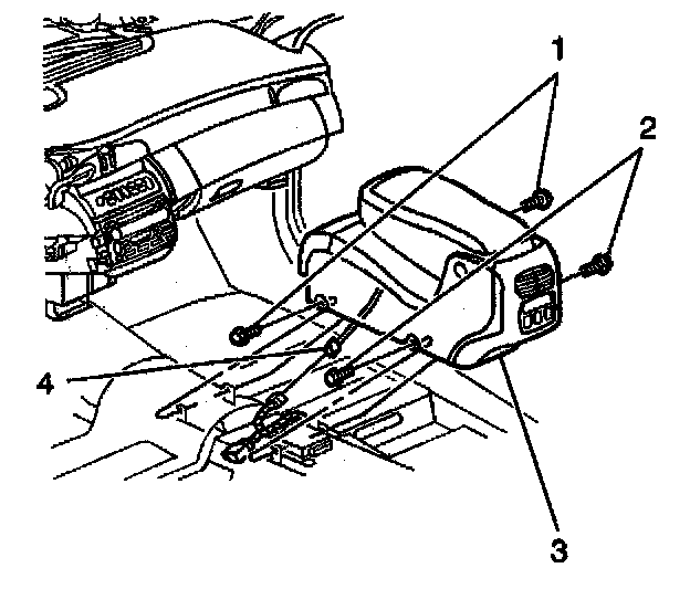 2. Move both driver and passenger seat forward and/or to the rear to gain access to front center seat fasteners (1).