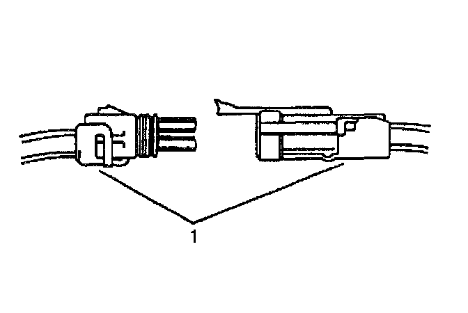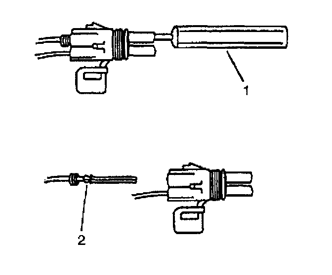 ^ Insert the Weather Pack(R) terminal removal tool into the front (mating end) of the connector cavity until it rests on the cavity shoulder (1).