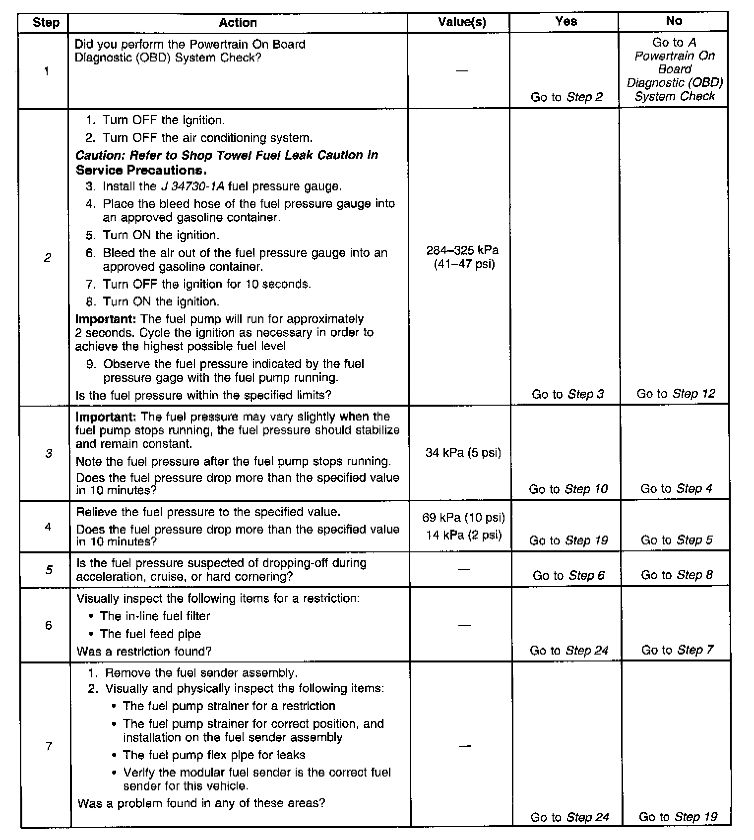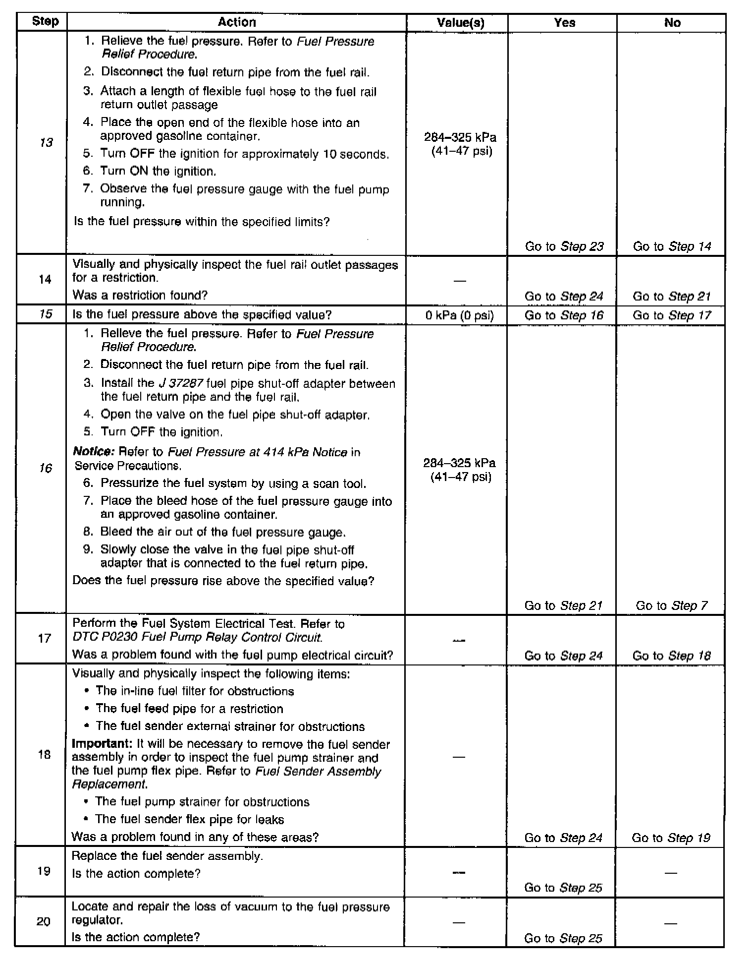 15. A lean condition may result from the fuel pressure being below 284 kPa (41 psi). A lean condition may cause a DTC P0131 or a DTC P0171 to set. Driveability conditions associated with lean conditions can include hard starting (when the engine is cold), hesitation, poor driveability, lack of power, surging, and misfiring.