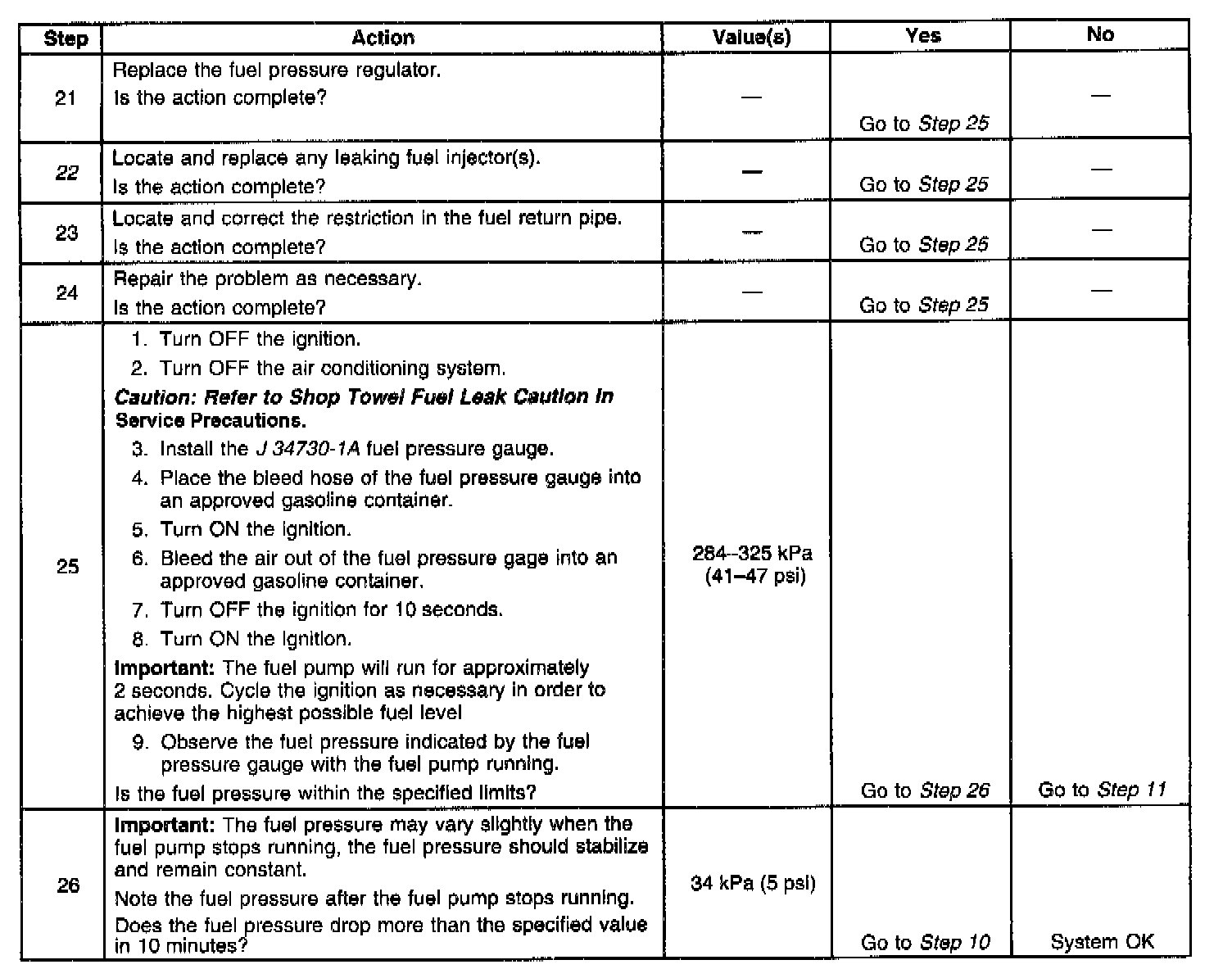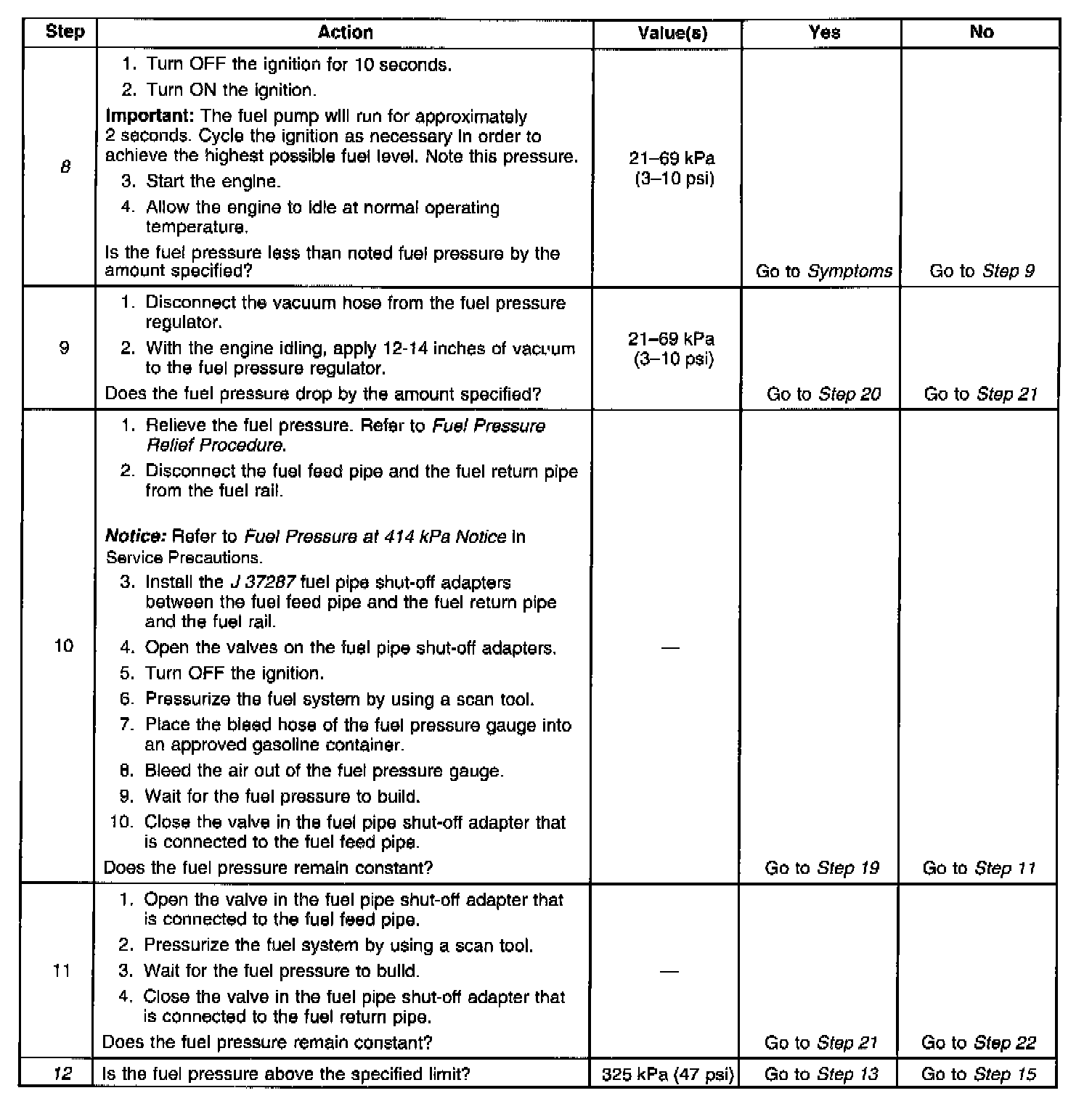 13. This test determines if the high fuel pressure is due to a restricted fuel return pipe or if the high fuel pressure is due to a faulty fuel pressure regulator.