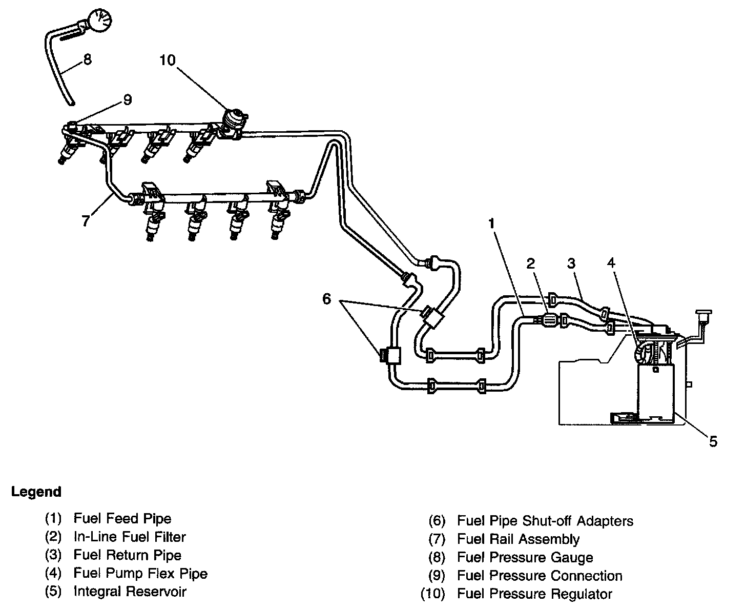 The in-tank fuel pump is an electric pump attached to the fuel sender assembly. The in-tank fuel pump supplies fuel through the fuel flex pipe through the fuel feed output fitting on the molded cover. The fuel then goes to the fuel feed pipe from the through an in-line fuel filter to the fuel rail assembly. The fuel pump is designed to provide fuel at a pressure above the pressure needed by the fuel injectors. A fuel pressure regulator, attached to the fuel rail, keeps the fuel available to the fuel injectors at a regulated pressure. Unused fuel is returned to the fuel tank by a separate fuel return pipe. The fuel pressure gauge J 34730-1A and fuel pipe shut-off adapters J 37287 are use for fuel system diagnosis. The fuel pressure gauge connects to the fuel pressure connection.