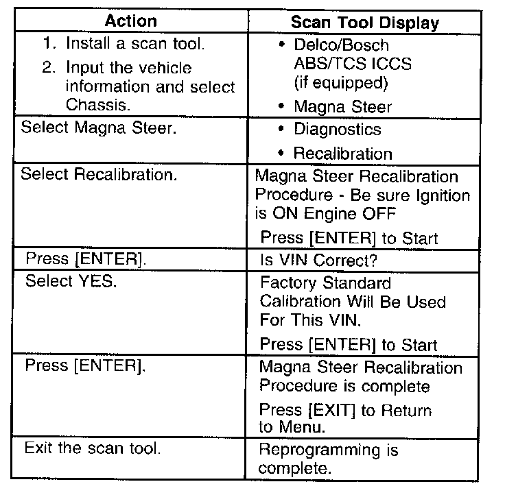 system has only one response mode. Use a scan tool and the following table in order to recalibrate the Variable Effort Steering system.