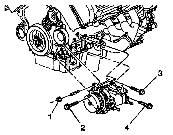 4. Install the A/C compressor mounting fasteners (1, 2, 3, 4) and hand tighten the fasteners.