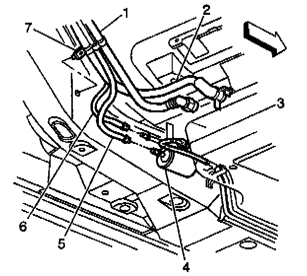 6. Reposition the retainer (7), the fuel tank vapor hose (1), the EVAP hose (2), or the purge hose (3) if necessary.