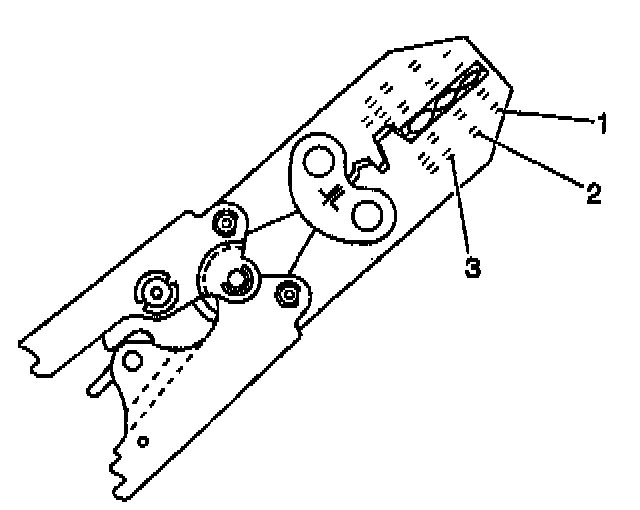 6. Place the splice sleeve in the nest. Ensure that the crimp falls midway between the end of the barrel and the stop. The sleeve has a stop (3) in the middle of the barrel (2) in order to prevent the wire (1) from going further. Close the hand crimper handles slightly in order to firmly hold the splice sleeve in the proper nest.