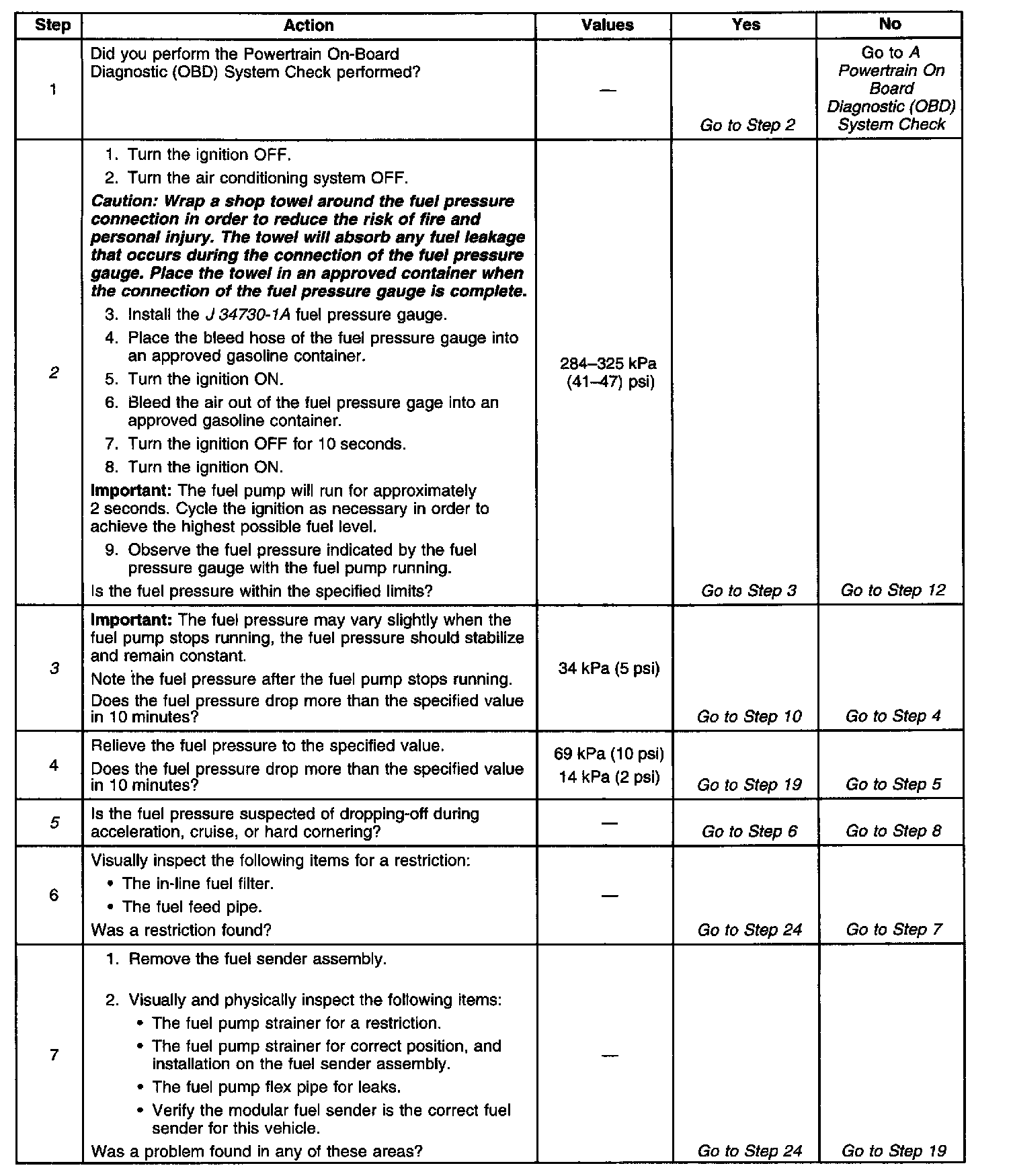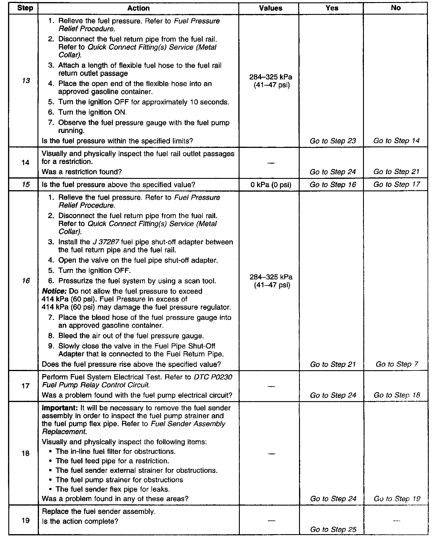 15. A lean condition may result from the fuel pressure being below 284 kPa (41 psi). A lean condition may cause a DTC P0131 or a DTC P0171 to set. Driveability conditions associated with lean conditions can include hard starting (when the engine is cold), hesitation, poor driveability, lack of power, surging, and misfiring.