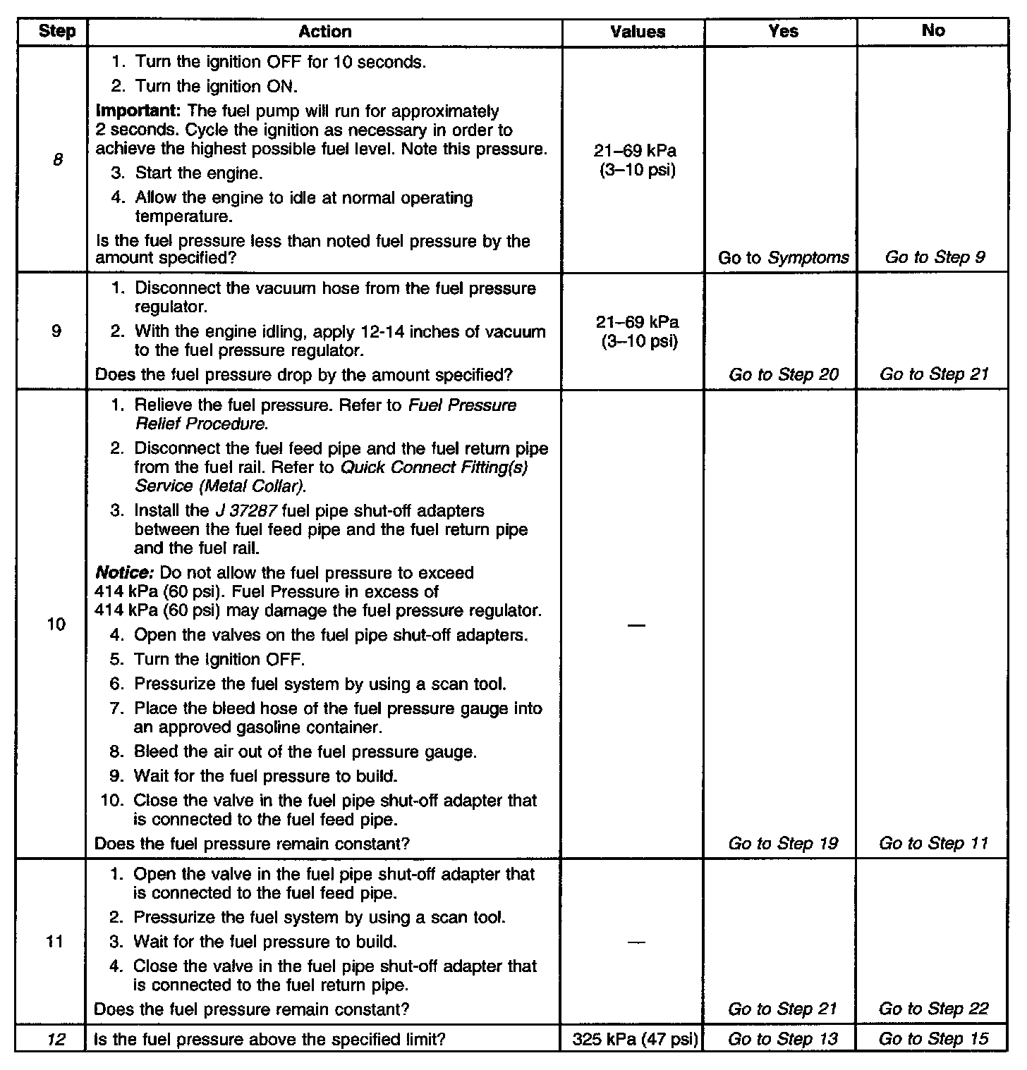 13. This test determines if the high fuel pressure is due to a restricted fuel return pipe or if the high fuel pressure is due to a faulty fuel pressure regulator.