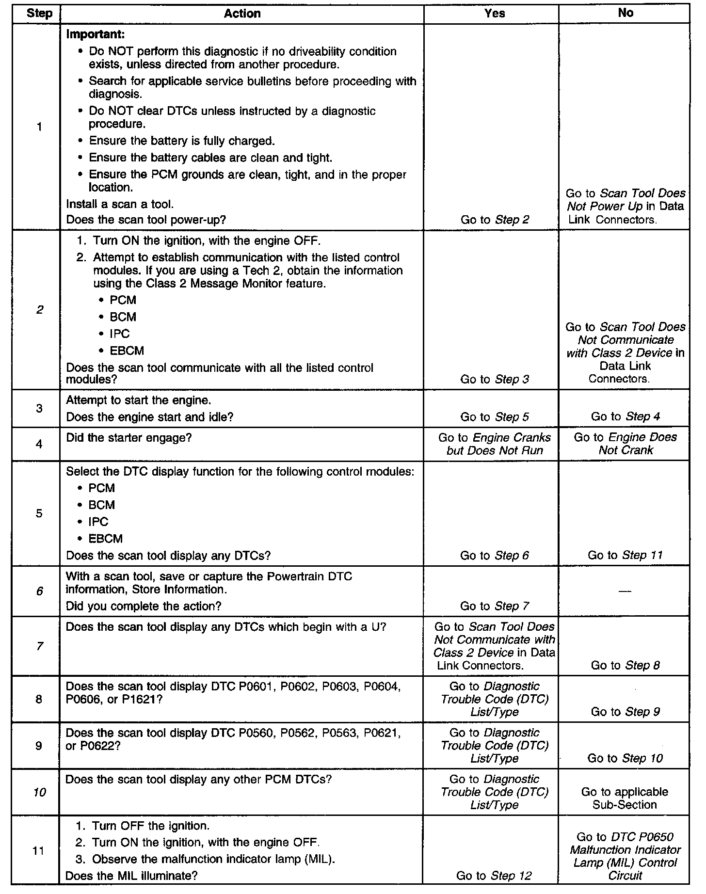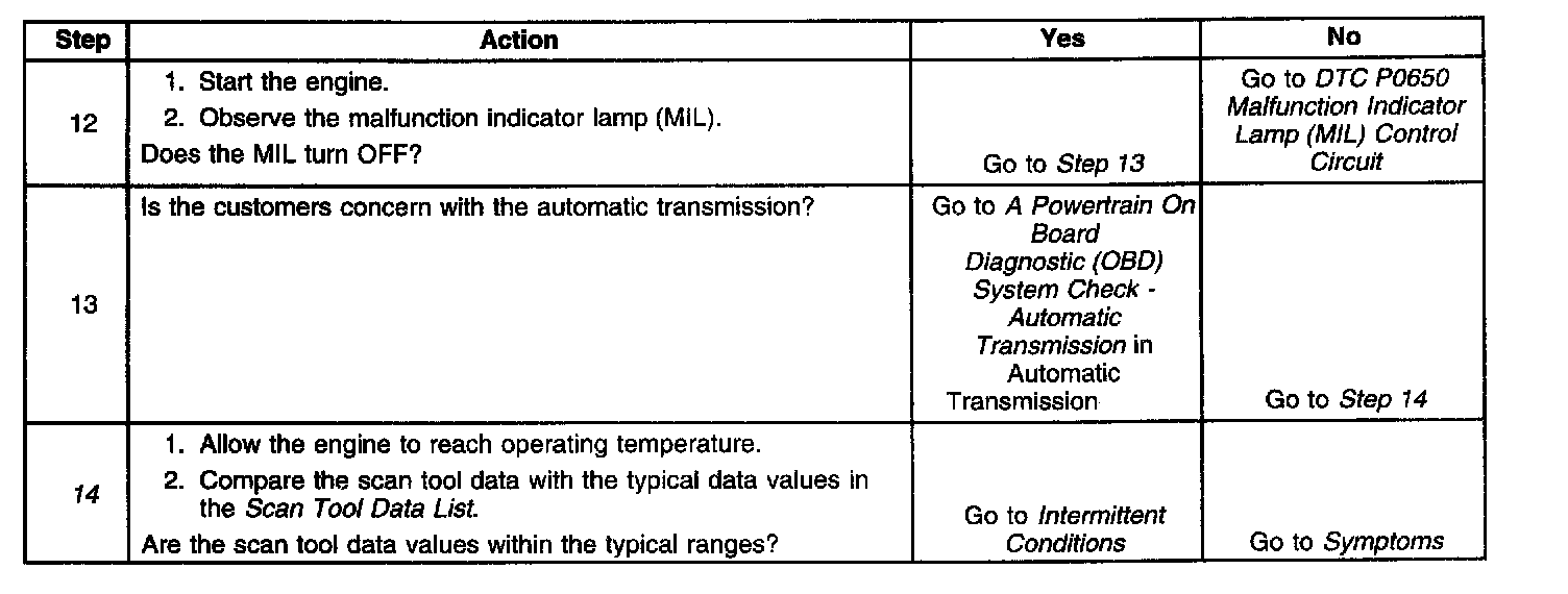 The Powertrain On Board Diagnostic (OBD) System Check is an organized approach to identifying a condition created by an electronic engine control system malfunction. The Powertrain OBD System Check must be the starting point for any driveability concern diagnosis, because it directs the service technician to the next logical step in diagnosing the concern. Understanding the table and using it correctly reduces diagnostic time and prevents the replacement of good parts.