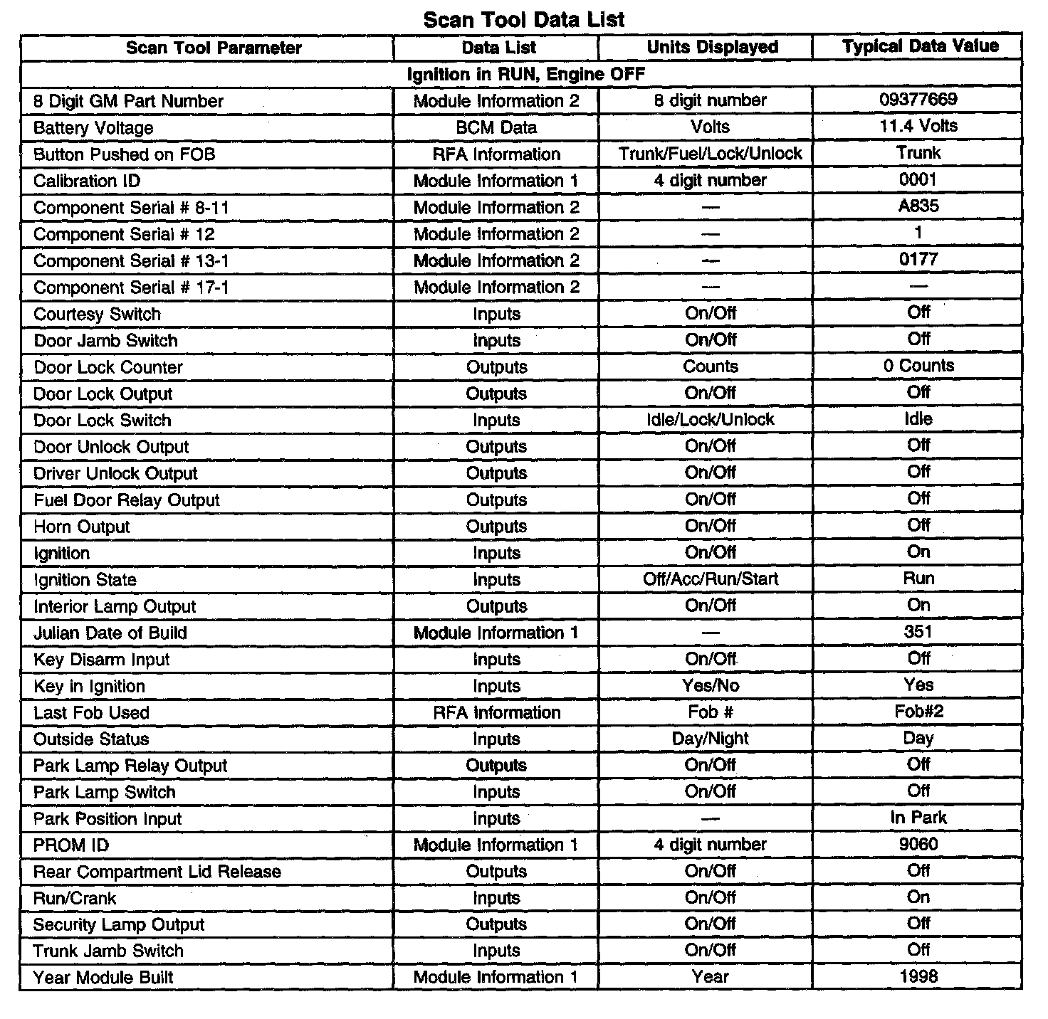 The Keyless Entry Scan Tool Data List contains all of the keyless entry related parameters that are available on the scan tool. The parameters in the list are arranged in alphabetical order. The column, Data List, indicates the location of the parameter within the scan tool menu selections. Use the Keyless Entry Scan Tool Data List as directed by a diagnostic table or in order to supplement the diagnostic procedures. Begin all of the diagnostic procedures with Diagnostic System Check - Remote Keyless Entry.