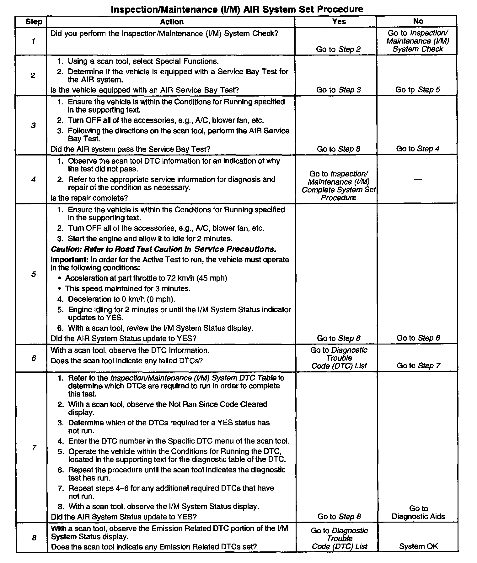 3. This step is to determine whether or not the AIR Service Bay Test has passed. If the system is operating correctly, the scan tool will not display any DTCs for the system and the I/M System status updates to YES. If the AIR Service Bay Test aborts because of lost enable conditions, the test can be repeated once the enable criteria is met.