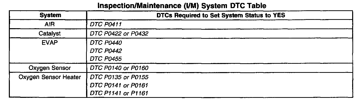 Inspection/Maintenance (I/M) System DTC Table: