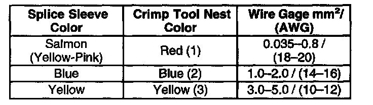 4. Select the proper sealed splice sleeve according to the wire size. Refer to the table at the beginning of the repair procedure for the color coding of the splice sleeves and the crimp tool nests.