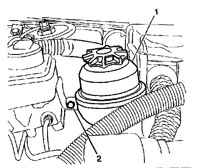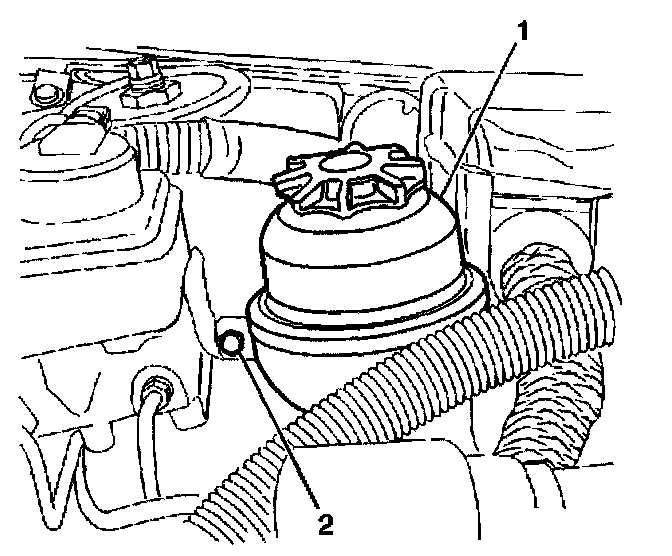 2. Remove the power steering fluid reservoir bolt (2).