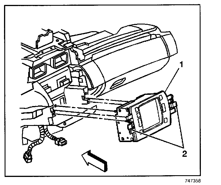 2. Align the navigation display alignment pins to the IP opening, push the navigation display (1) toward the front of the vehicle until an audible click is heard.