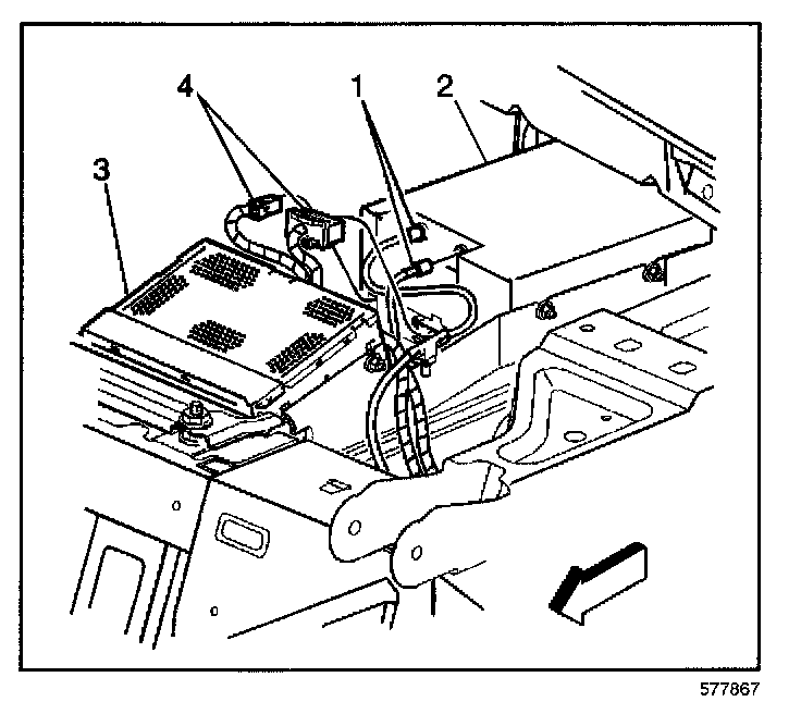 7. Disconnect the electrical connections (1, 4) from the navigation data processor (2) and from the radio receiver (3).
