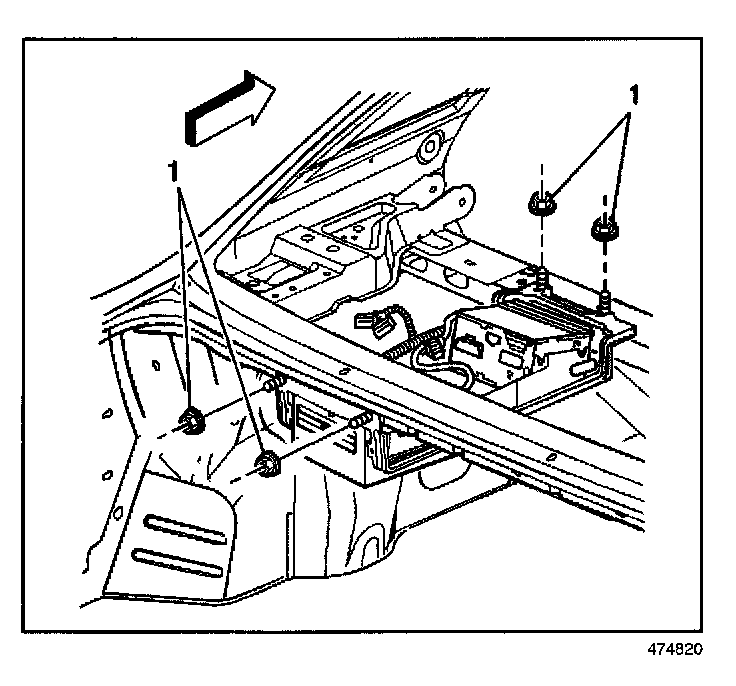8. Remove the fasteners (1) retaining the navigation data processor / radio bracket to the rear shelf.