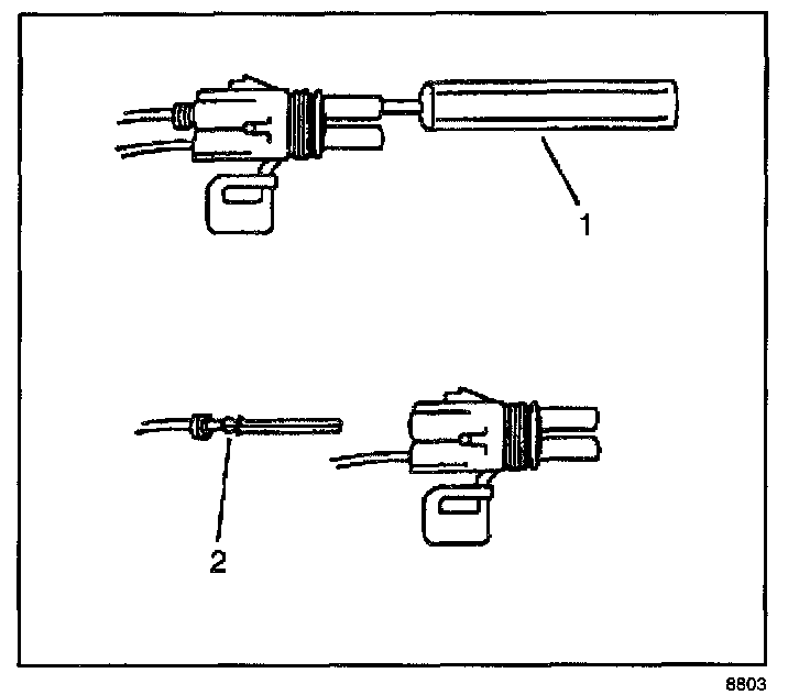 4. Insert the Weather Pack(R) terminal removal tool into the front (mating end) of the connector cavity until it rests on the cavity shoulder (1).