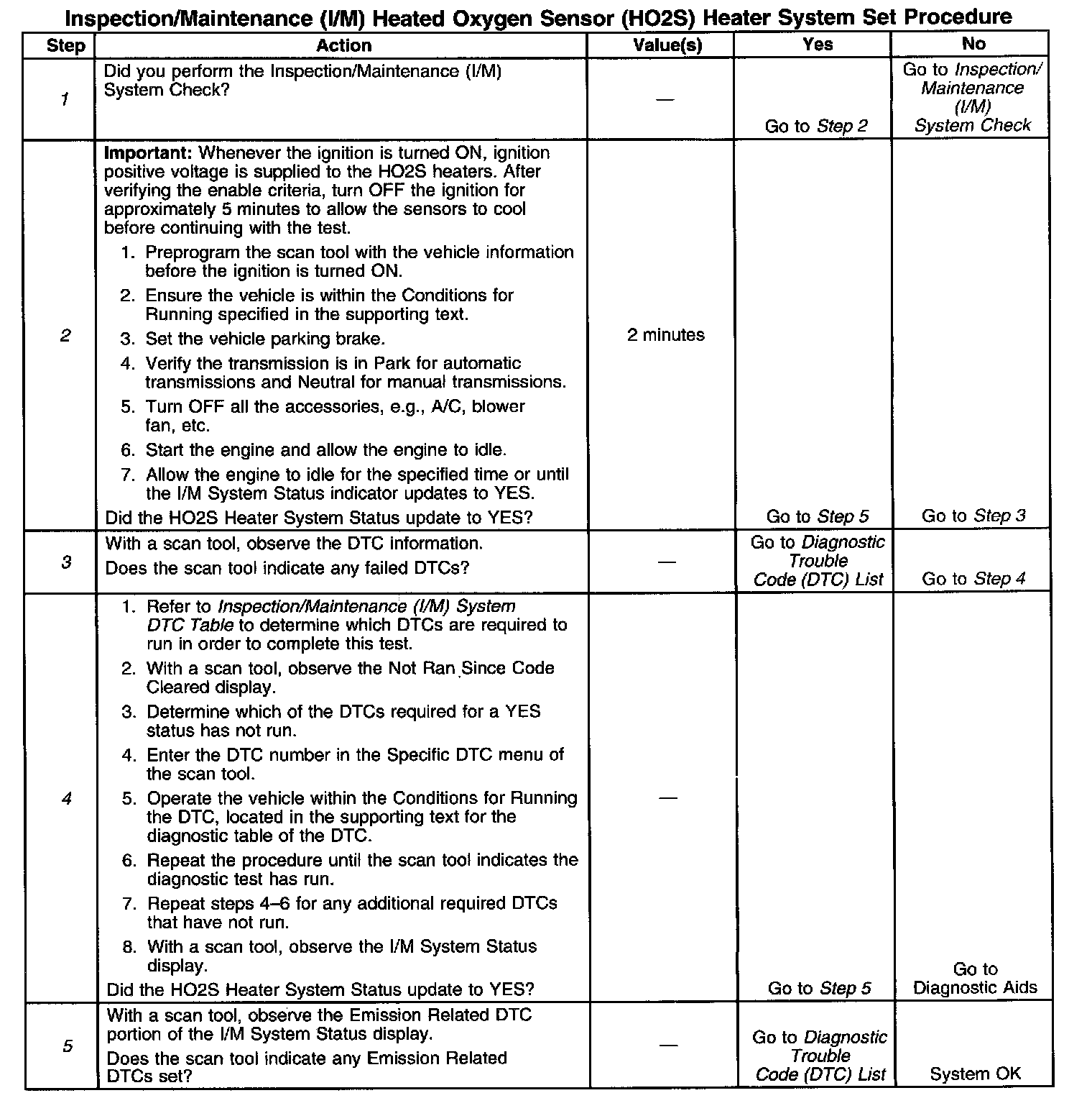 3. This step identifies a first failure of a type B DTC. A DTC only appears on the I/M System Status display when it becomes a MIL illuminating DTC. This occurs on the second failure of a type B DTC. A first failure of a type B DTC will not allow the I/M System Status to update to YES. Refer to Diagnostic Aids.
