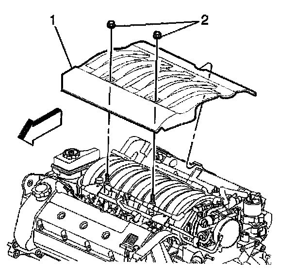 2. Remove the nuts (2) from the fuel injector sight shield (1).