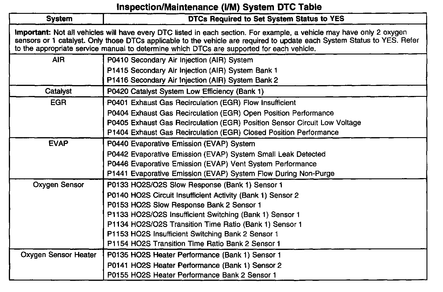 I/M System DTC Table
