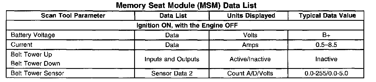 Memory Seat Module (MSM) Data List: