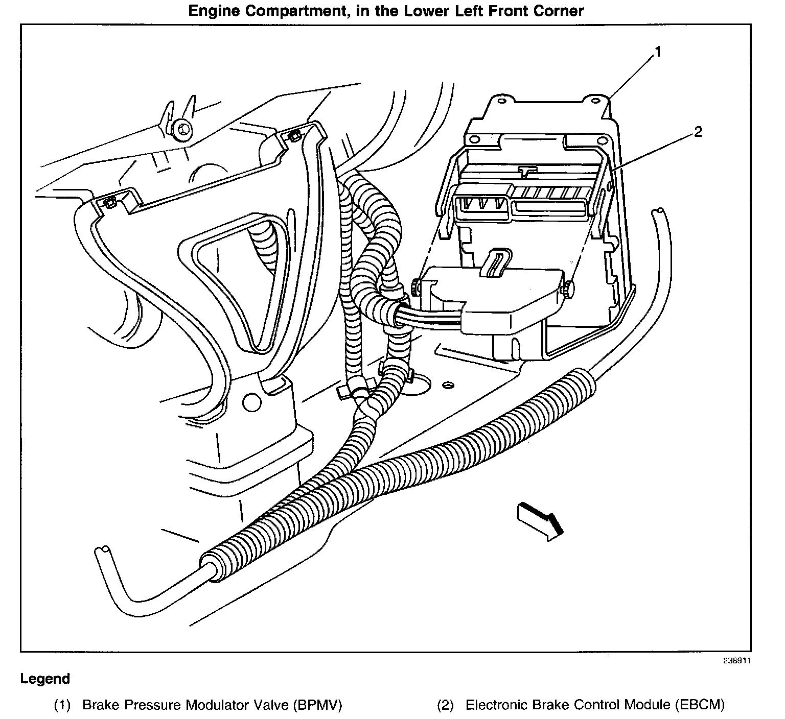 On the left front corner of the engine compartment, on the brake pressure modulator valve