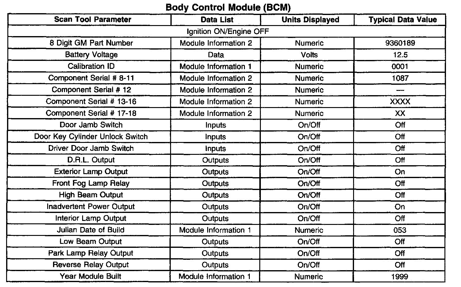 Scan Tool Data List - Body Control Module (BCM)