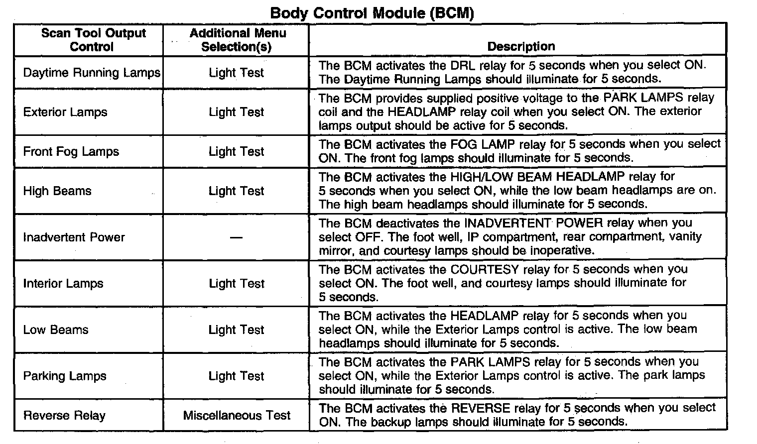 Scan Tool Output Controls - Body Control Module (BCM)