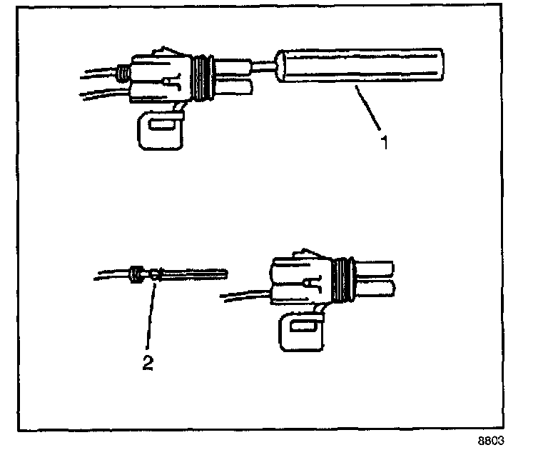 4. Insert the Weather Pack(R) terminal removal tool into the front (mating end) of the connector cavity until it rests on the cavity shoulder (1).
