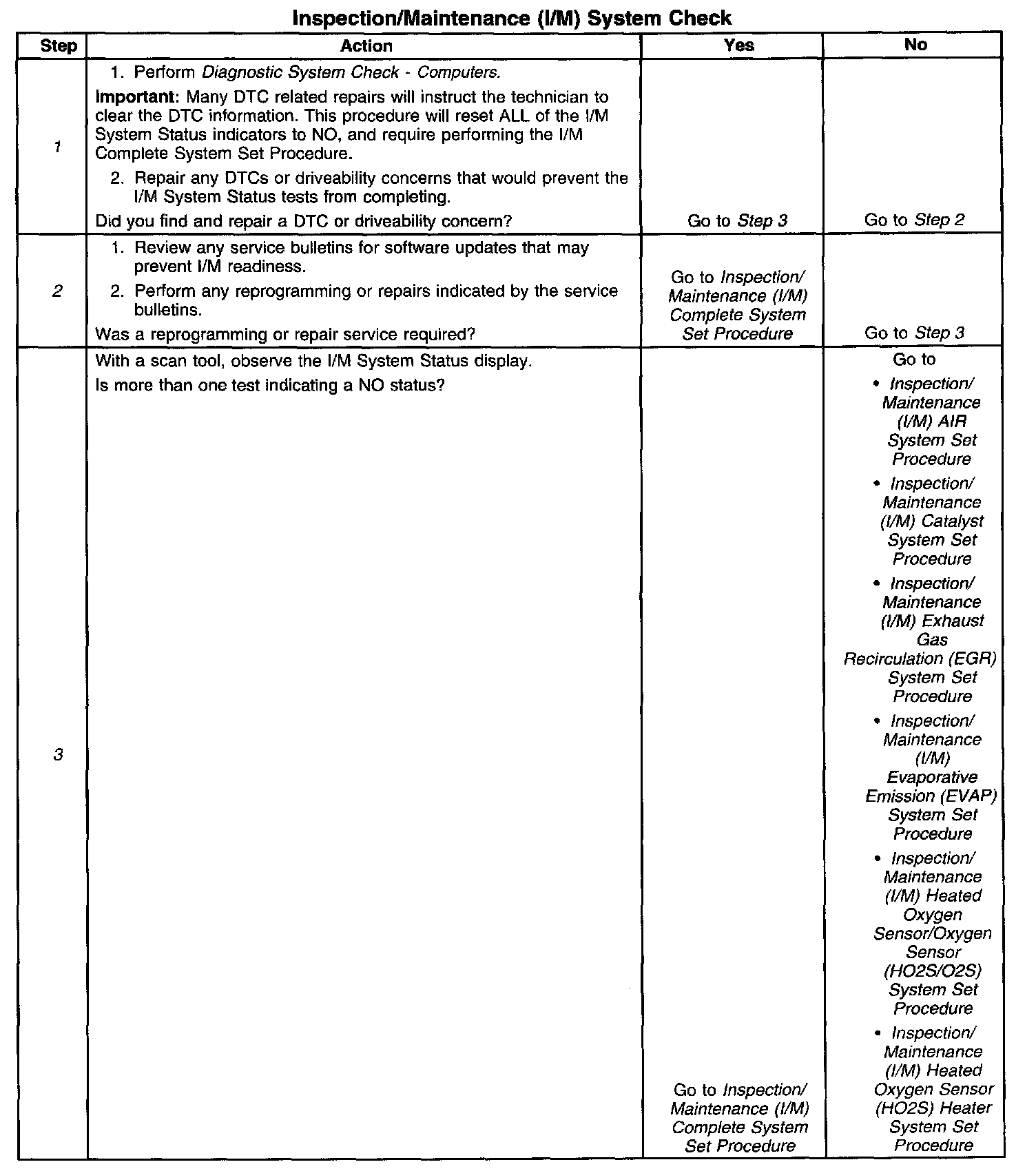 1. Any DTCs set, even those that are not listed in the Inspection/Maintenance System DTC Table, may prevent the required DTCs from running. If there is any question as to whether a set DTC is disabling the required I/M diagnostic, review the Conditions for Running in the diagnostic procedures for the DTC required by the I/M diagnostic. A list of disabling DTCs, if applicable, is contained in the supporting text for that DTC.