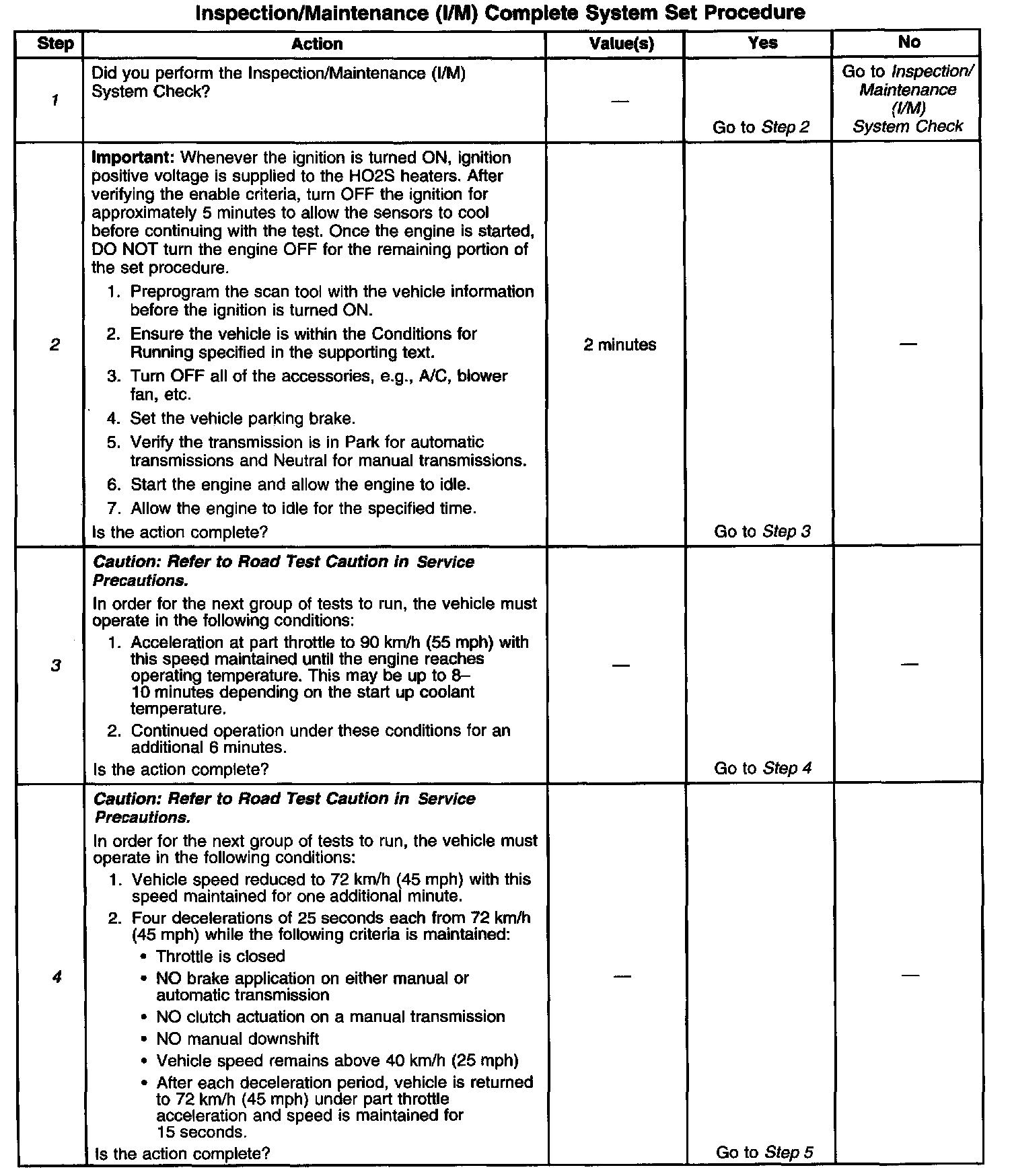 DESCRIPTIONThe purpose of the I/M Complete System Set Procedure is to satisfy the enable criteria necessary to execute all of the I/M readiness diagnostics, and complete the trips for those particular diagnostics. When all diagnostic tests are completed, the I/M System Status indicators are set to YES. Perform this test when more than one or all of the I/M System Status indicators are set to NO.