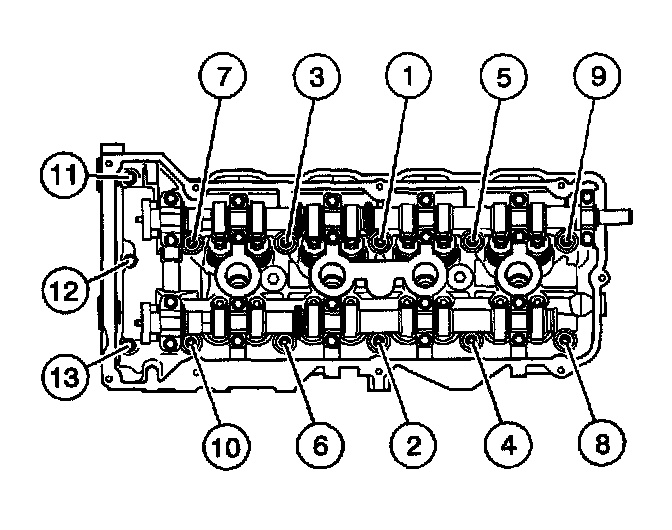 Tighten the left cylinder head M11 cylinder head bolts to 40 Nm (30 ft. lbs.) in the sequence shown.
