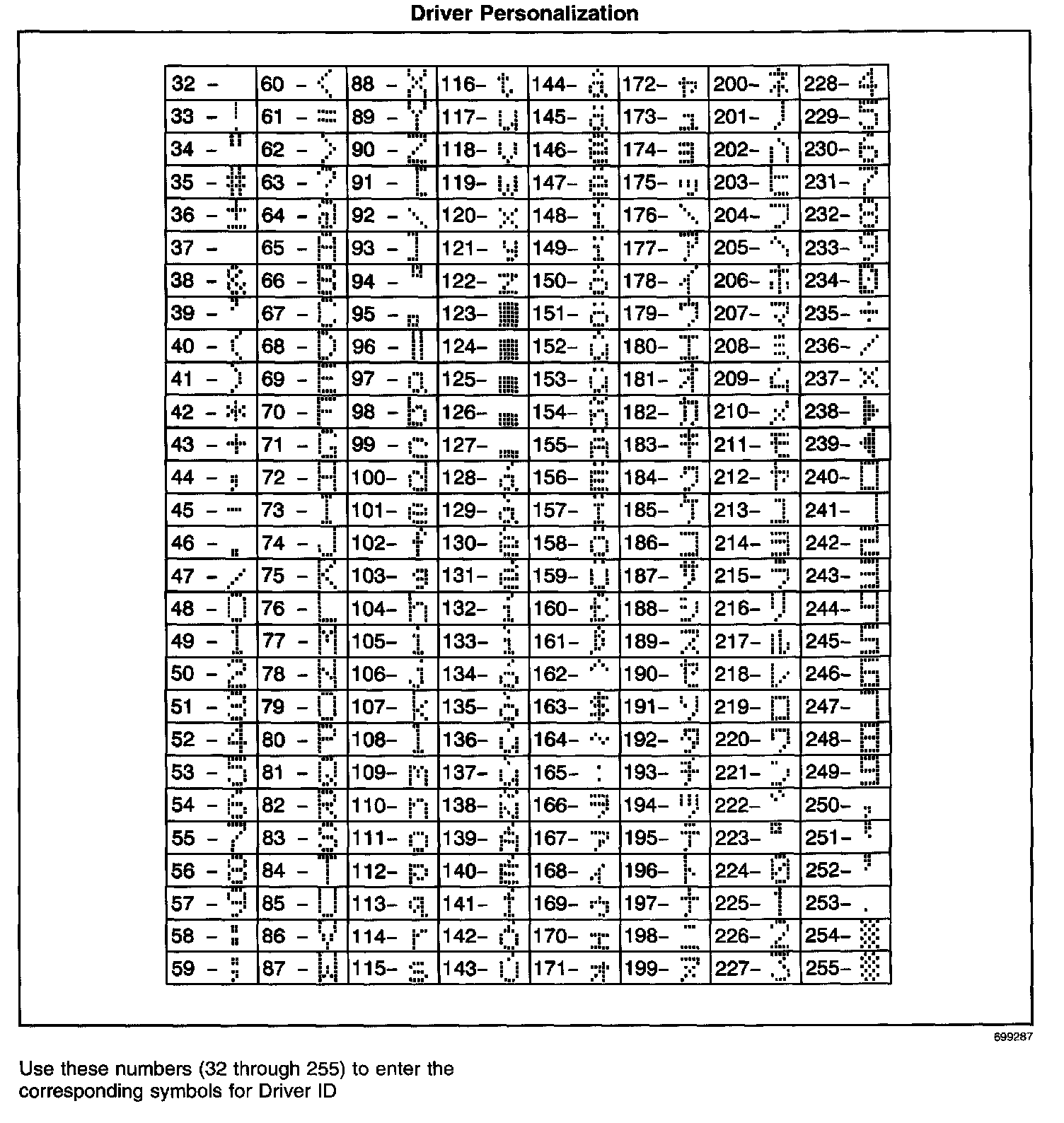 Driver Personalization - ASCII Character Table