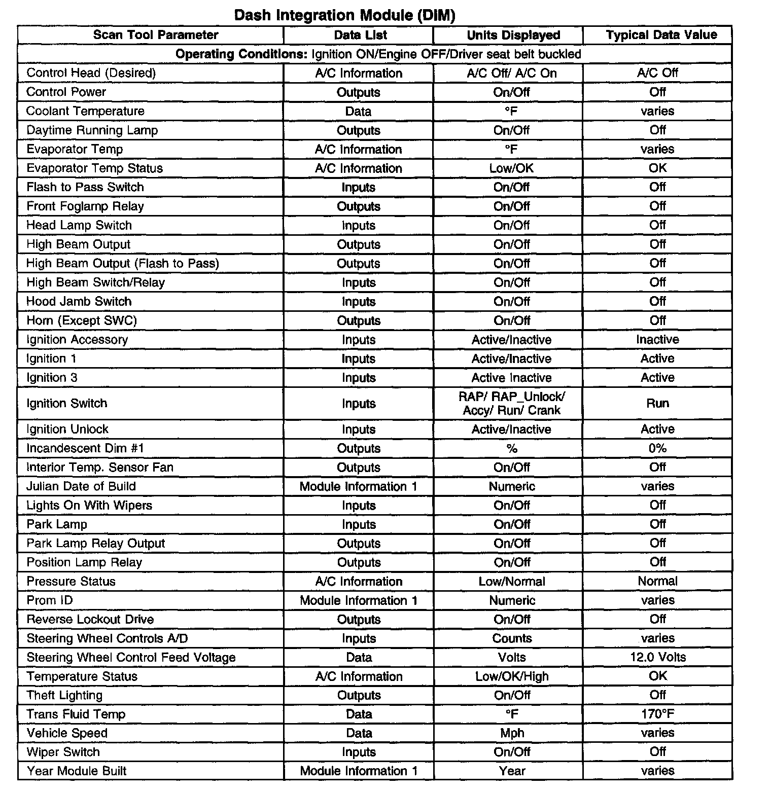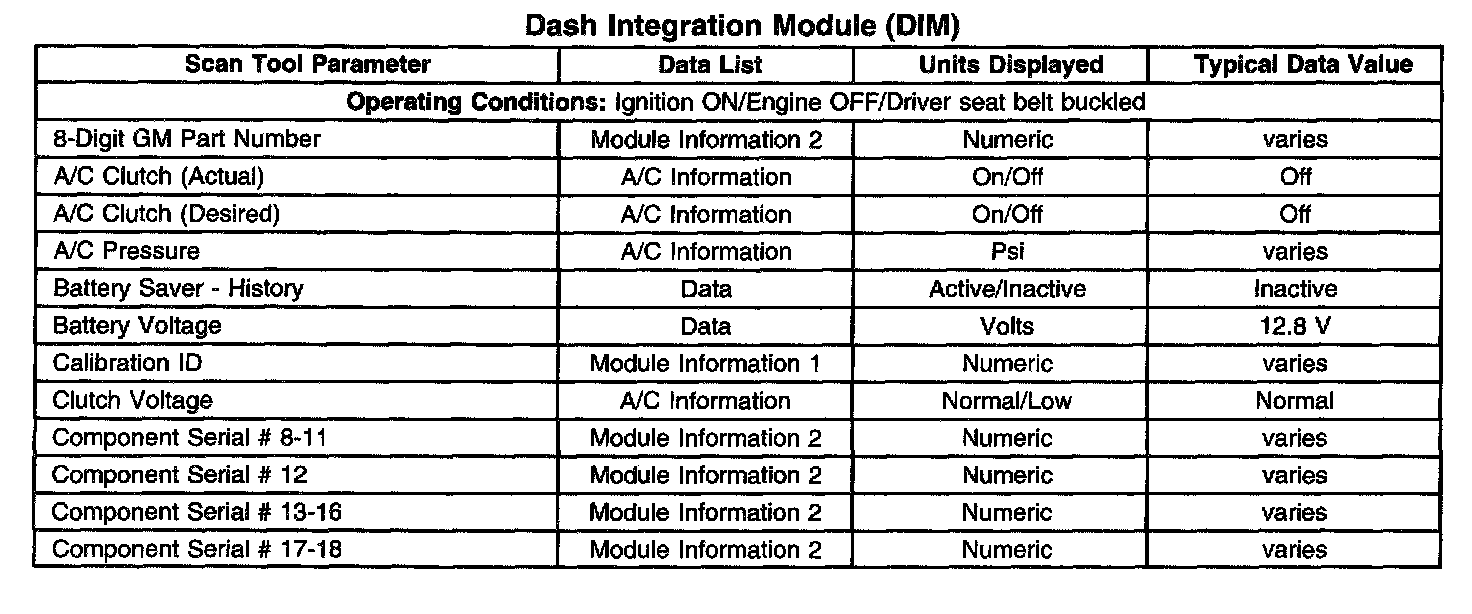 Scan Tool Data List - Dash Integration Module (DIM)