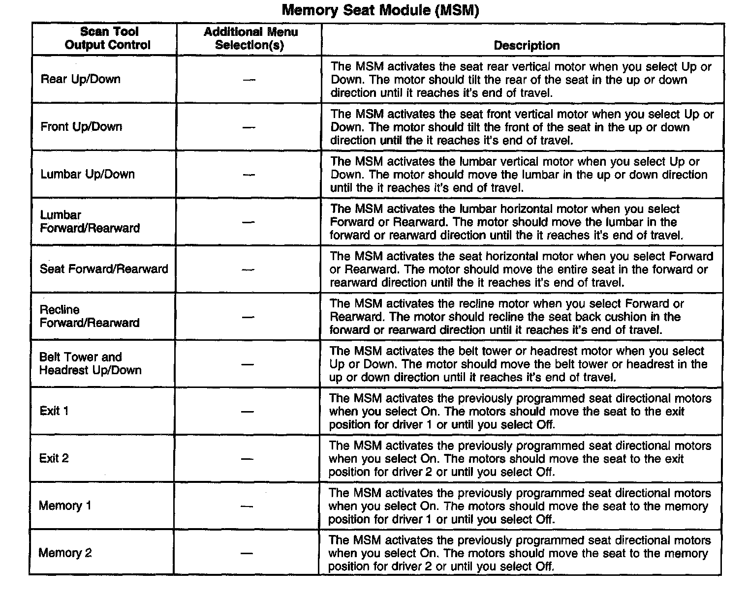 Scan Tool Output Controls - Memory Seat Module (MSM)