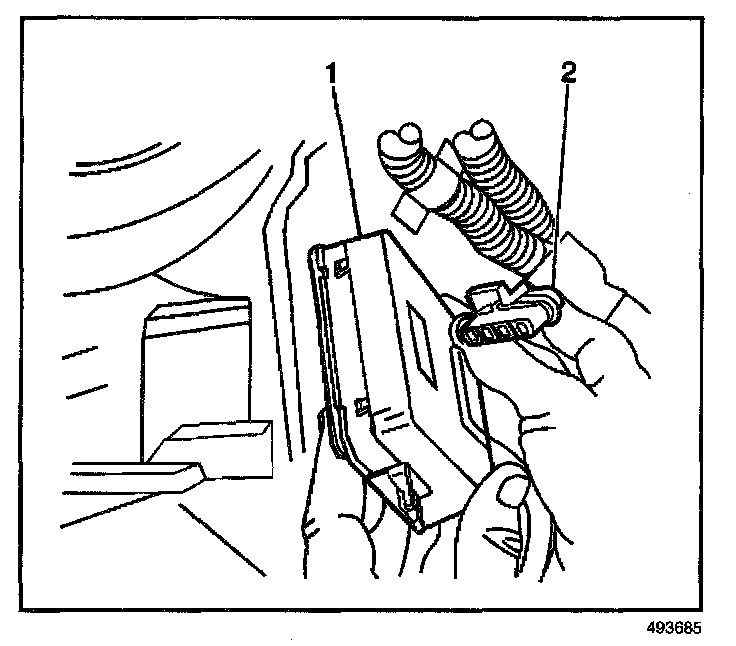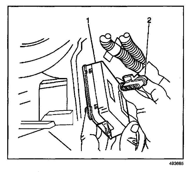 7. Remove the electrical connector (2) from the blower motor control module (1).