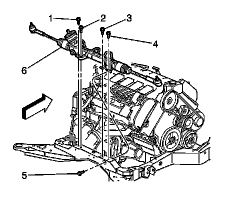 9. Remove the fasteners (1,2,3,4) and the horizontal fastener (5) retaining the rack and pinion (6) to the engine frame. Refer to Power Steering Gear Replacement in Power Steering System.