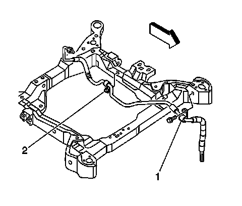 19. Install the bracket bolt (1) and engage the retainer clip (2) in order to secure the power steering gear outlet hose to the frame.