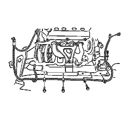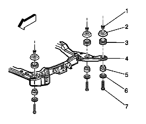 6. Install the engine frame insulator fasteners (3) to retain the engine frame (2) to the vehicle.