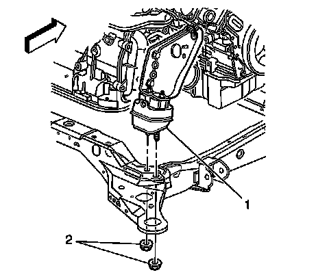 17. Remove the fasteners (2) retaining the right transaxle mount (1) to the engine frame. Refer to Automatic Transmission Mount Replacement - Right in Transmission/Transaxle.